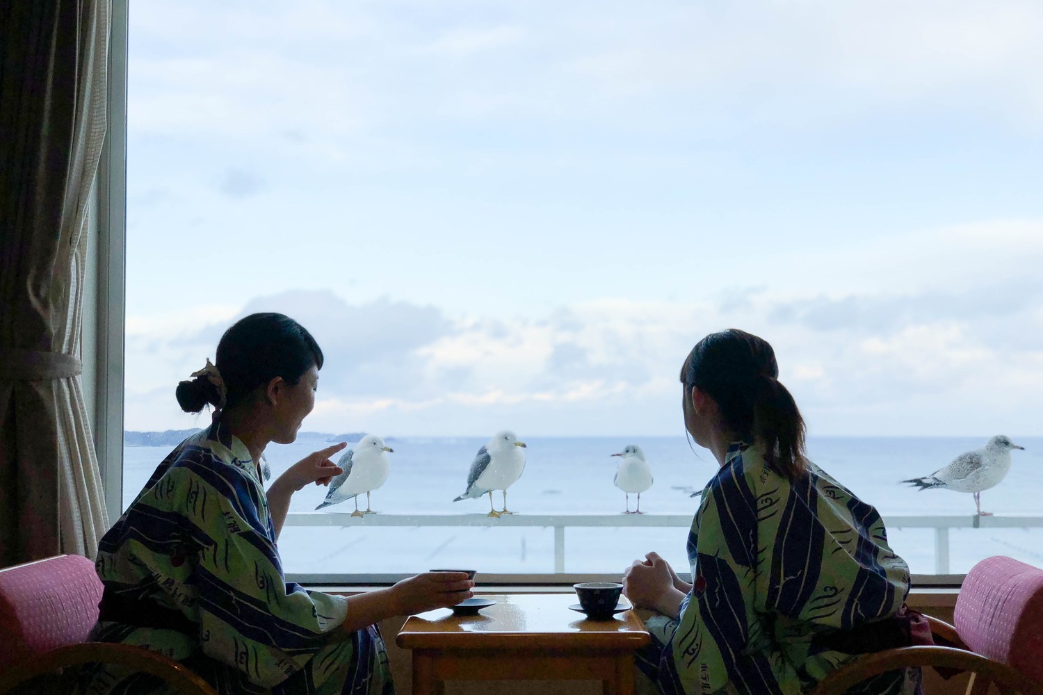 かもめが近くを飛び交う開放感あふれる浴場で、